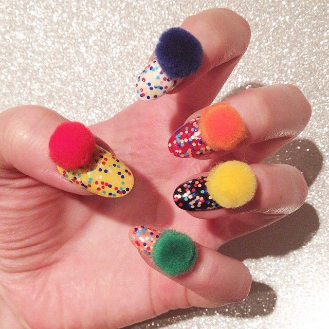 До чого дійшов прогрес - тепер модно носити на нігтях помпони. Це такі маленькі кольорові кульки. Як ходити з такою "красою" в реальному житті - поки не зрозуміло. Скажімо так - тренд на любителя.